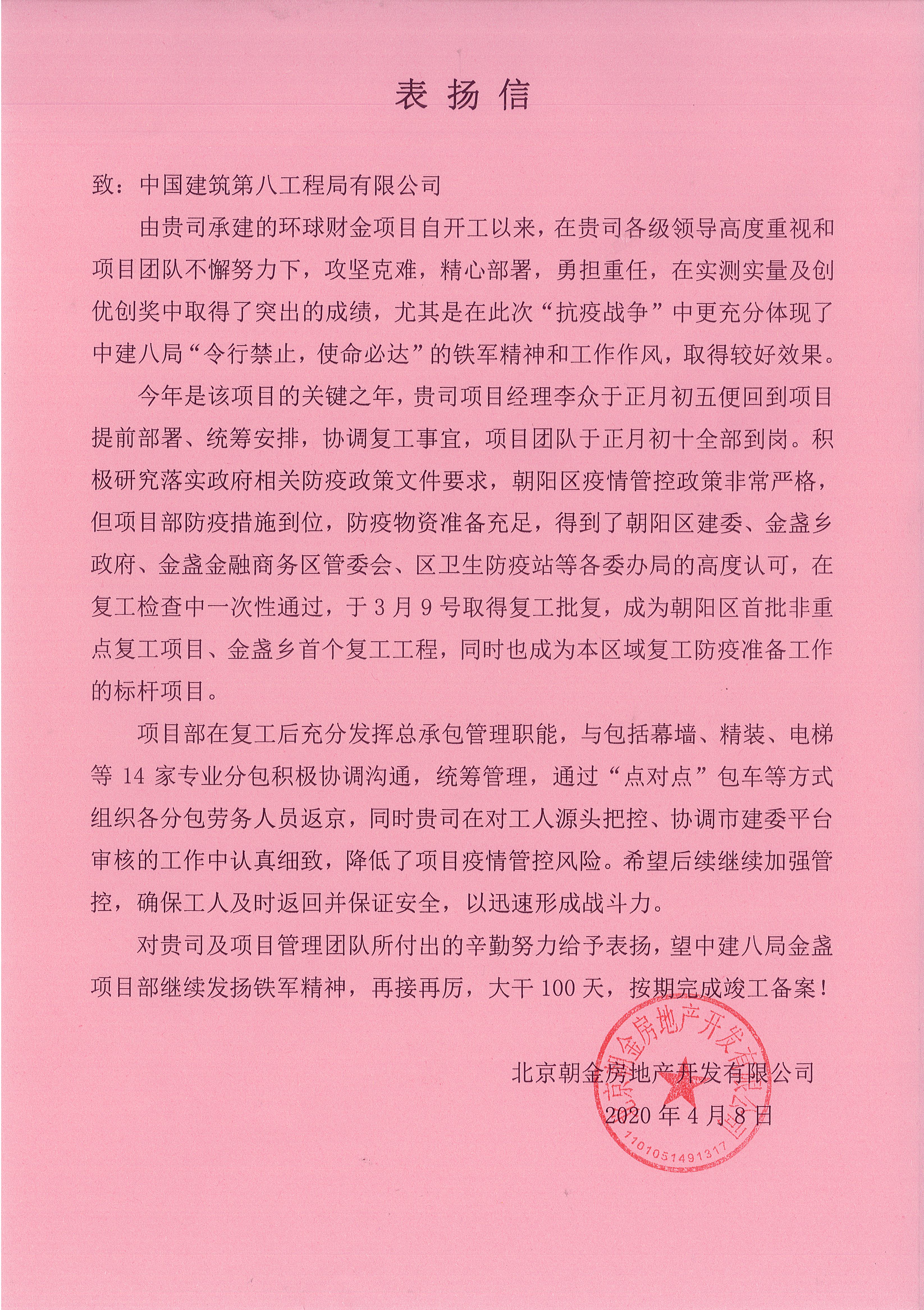 4月9日,北京金盞項(xiàng)目喜獲業(yè)主單位招商局地產(chǎn)發(fā)來的表揚(yáng)信,信中對項(xiàng)目部在實(shí)測實(shí)量及創(chuàng)優(yōu)創(chuàng)獎中取得的突出成績,在“抗疫戰(zhàn)爭”中防控工作、組織復(fù)工等方面的工作給予高度評價(jià)