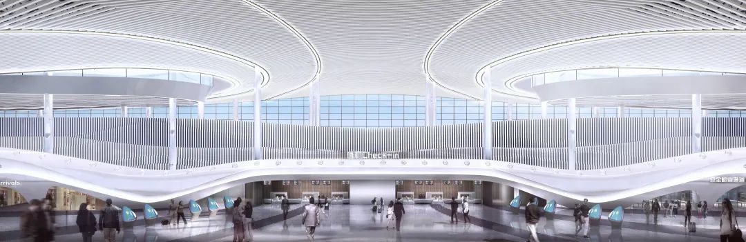 航站樓的設計理念汲取當地深厚的儒家文化,與獨有的運河文化航站樓屋面造型初見,如璞玉般明潤和諧,又如祥云般蒸騰而升。項目從“祥云璞玉”的儒圣精神著手,暗合“君子如玉”的儒家精神,屋檐走勢如水,波浪起伏,象征著運河文化帶來的流暢與鮮活,將古建筑“重檐屋頂、斗拱、柱列”的特點,與現代機場建設相結合,典雅溫潤,渾然天成。室內以“大成飛檐、河映孔孟”為主題,氛圍儒雅詩意,吊頂順應天窗形式,展現出運河融南匯北的壯美畫卷,運河之都,名副其實,打造濟寧獨特的儒家文化名片。
