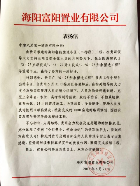 經過25天縝密籌劃,爭分奪秒的戰斗,海陽魯能勝地小區(二標段)項目順利完成了“6·25形象塑造工程”節點,喜獲業主表揚信。