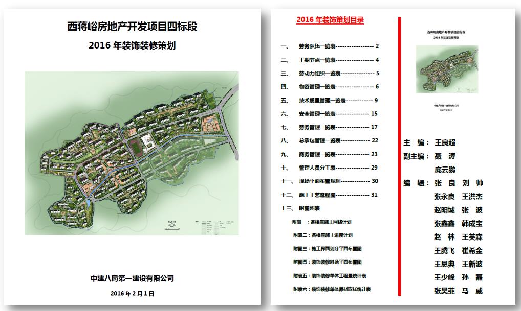如何確保19棟單體工程裝飾階段各項指標的完成,他也是費盡了心機,組織項目管理人員歷時兩個多月的時間,編制完成《西蔣峪四標段2016年裝飾裝修策劃書》,將“工期節點一覽表”、“勞動力組織一覽表”、“物資采購技術參數一覽表”、“成本控制措施一覽表”、“裝飾做法五張圖”、“質量控制要點”、“安全管控要點”等13個方面全部收入囊中,對住宅工程裝飾裝修全生命周期進行精細策劃。同時于2016年5月17日成立了“王良超項目精細化管理創新辦公室”。