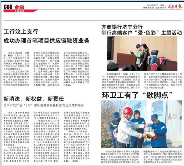 “……‘我們建筑工和清潔工是一個階層,他們的辛苦我們也感同身受。’項目部安全總監黃繼明如此表示設立的目的。”這篇題為《環衛工有了歇腳點》的報道刊登在了《齊魯晚報》3月17日C08版,對一公司濟寧人醫院項目部設立“環衛工歇腳點”的做法進行了報道。