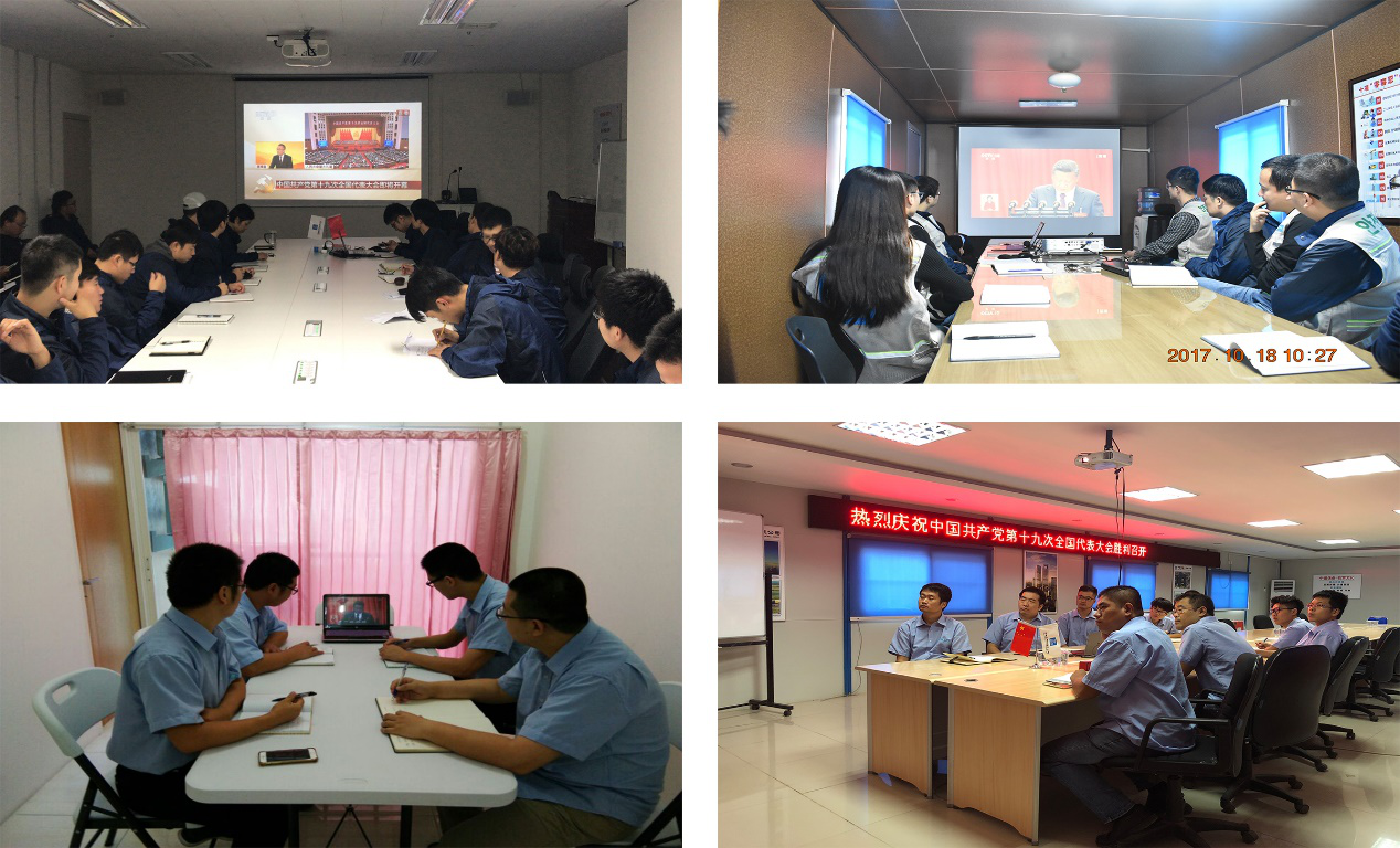 上午9點,在公司黨委書記、董事長董文祥的帶領下,公司總部機關近百名員工于公司會議室準時觀看十九大開幕會。與此同時,十四家二級單位和百余個工程總承包項目紛紛組織人員觀看。海外項目的成員即使身在國外,依舊心懷祖國,毛里求斯當地時間凌晨四點,伊甸園文化娛樂廣場項目的員工們就早早的端坐在會議室收看起了實況轉播;印尼一號雙塔、韓國濟州夢想大廈、韓國濟州Cypress高爾夫&度假村、印尼泗水Satoria Office Tower等項目的員工積極收看十九大并認真做記錄。