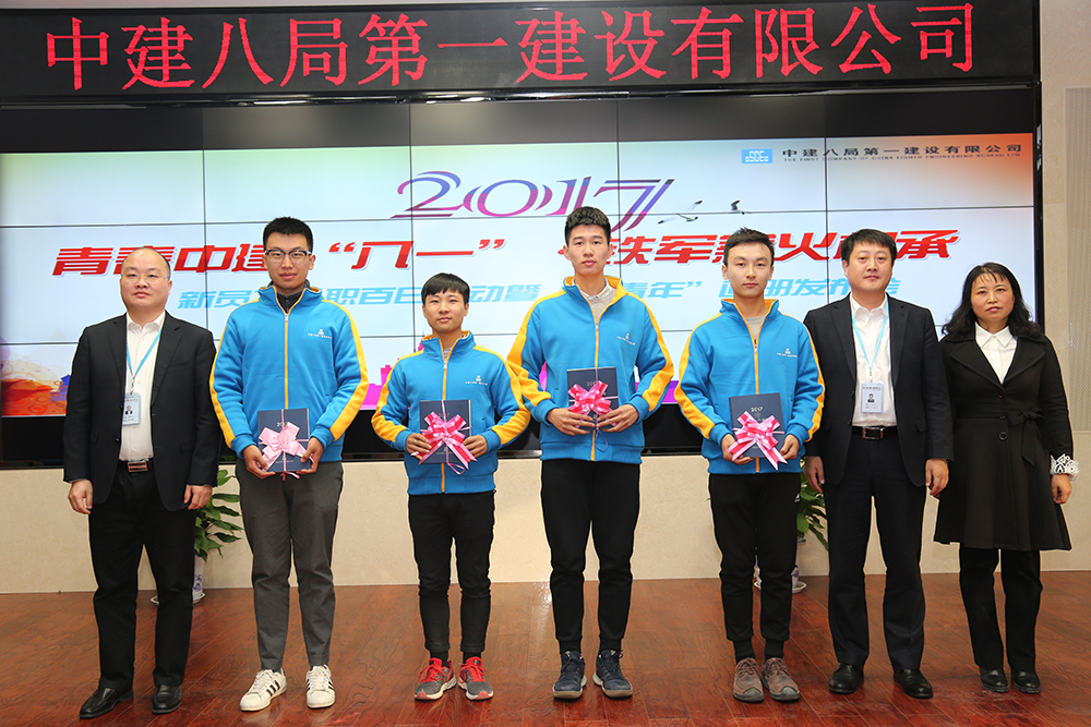 公司黨委書記、董事長董文祥,公司總經理哈小平,公司總會計師熊知平,公司總經濟師許長輝,助理總經理郭亞妹,濟南分公司書記霍文濤、基礎設施分公司書記韓成濤,為新員工代表頒發新青年紀念畫冊。