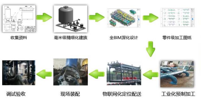 機(jī)房深化設(shè)計(jì)并出具圖紙:分析圖紙并收集整合大量資料;對(duì)機(jī)房?jī)?nèi)的機(jī)械設(shè)備、閥部件等構(gòu)件進(jìn)行1:1毫米級(jí)精細(xì)化建族;充分利用狹小機(jī)房空間,深化設(shè)計(jì)形成多套方案;利用BIM模型結(jié)合VR虛擬現(xiàn)實(shí)技術(shù)選擇最優(yōu)的方案,并運(yùn)用Revit軟件直接出圖;綜合考慮施工順序、運(yùn)輸空間、操作便利性等因素,對(duì)設(shè)備、管道等進(jìn)行分段并形成加工圖紙。最后,將預(yù)制化圖紙交付場(chǎng)外工廠進(jìn)行預(yù)制化加工。整個(gè)過(guò)程用時(shí)25天。