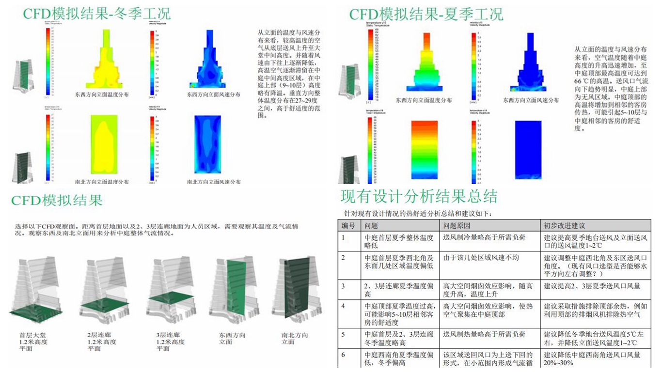 項(xiàng)目創(chuàng)新采用CFD技術(shù)進(jìn)行現(xiàn)場(chǎng)舒適度模擬。分析優(yōu)化暖通圖紙,采集大量影響舒適度的相關(guān)參數(shù),對(duì)整個(gè)大堂內(nèi)“夏季”、“冬季”兩種工況進(jìn)行模擬,最終通過(guò)計(jì)算機(jī)大量的數(shù)據(jù)計(jì)算得出結(jié)果,并提出改進(jìn)意見(jiàn),將舒適度調(diào)整到最佳。
