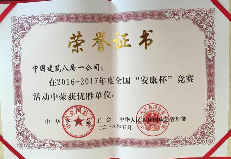 2018年6月12日,中華全國總工會(huì)和中華人民共和國應(yīng)急管理部在北京召開全國“安康杯”競賽活動(dòng)表彰暨經(jīng)驗(yàn)交流電視電話會(huì)議,一公司被授予全國“安康杯”競賽優(yōu)勝單位榮譽(yù),公司副總經(jīng)理寧文忠、工會(huì)工作部負(fù)責(zé)人方健代表公司現(xiàn)場接受了表彰。