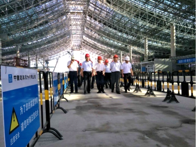 7月3日,中國鐵路濟南局集團公司董事長王秋榮、濟青高速鐵路有限公司董事長姜長興一行近100人蒞臨濟青高鐵紅島站房項目檢查指導工作。中建股份濟青高鐵指揮部指揮長程金生、濟青高鐵紅島站房項目經理馬俊峰及項目部主要管理人員陪同。