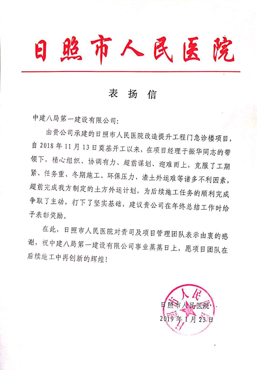 1月23日,日照市人民醫院改造提升工程門急診樓項目收到日照市人民醫院發來的表揚信。
