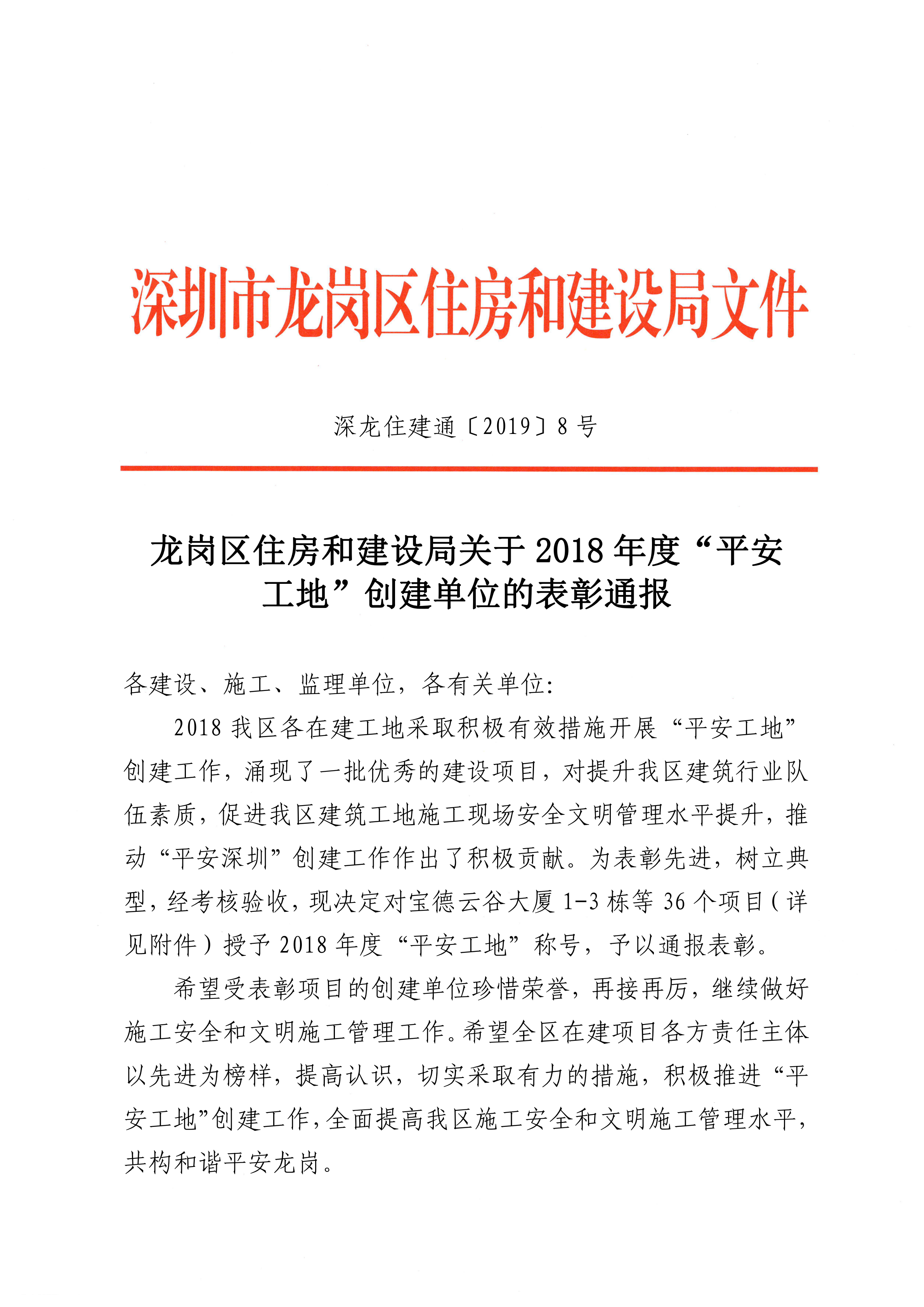 《龍崗區(qū)住房和建設局關于 2018 年度“平安工地”創(chuàng)建單位的表彰通報》
