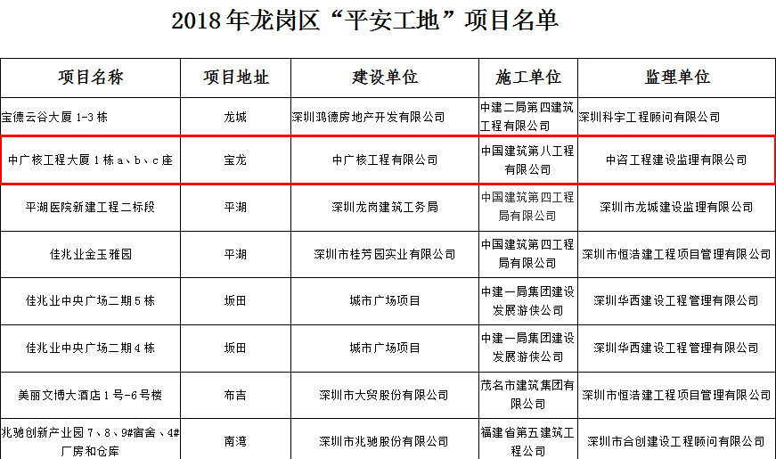近日,深圳市龍崗區(qū)住房和建設局對在促進龍崗區(qū)建筑工地施工現(xiàn)場安全文明管理水平提升,推動“平安深圳”創(chuàng)建工作作出了積極貢獻的項目授予 2018 年度“平安工地”稱號,并予以通報表彰。中廣核工程大廈項目榮獲“平安工地”稱號。