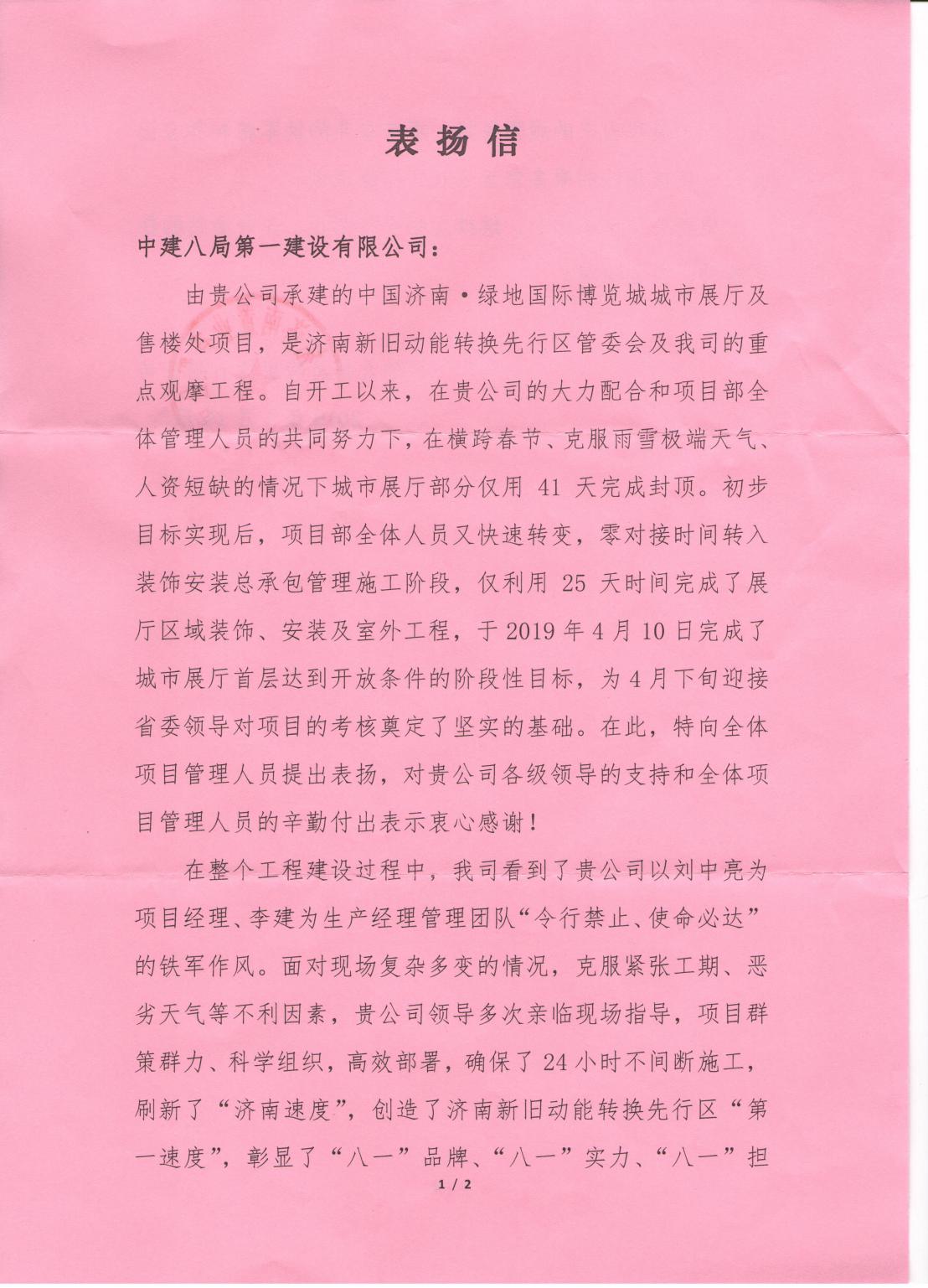 綠地國際博覽城項目正式進場后,精心組織施工、倒排工期節點目標、質量控制到位,積極解決多方交叉施工引發的問題,于2019410日按時、保質完成綠地國博城城市展廳一層開放節點。從21號機械人員正式入場,到具備對外開放條件,綠地國博城城市展廳項目只用了68天。項目部通過良好的履約,得到業主方充分肯定,并于422日授予項目部錦旗,贊揚濟南分公司項目經理劉中亮、生產經理李建帶領下的項目管理團隊“令行禁止、使命必達”的鐵軍精神。(王曦)