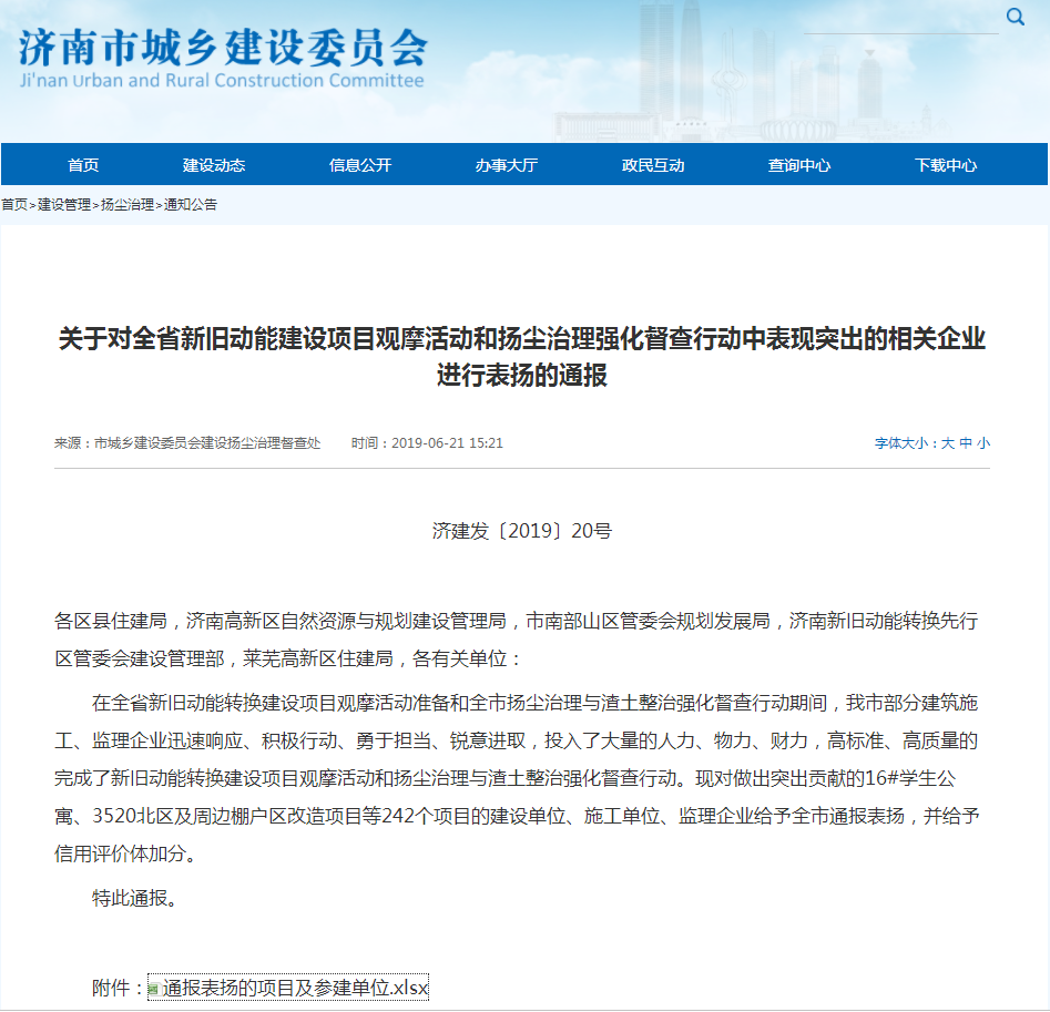 公司揚塵治理獲濟南市通報表揚