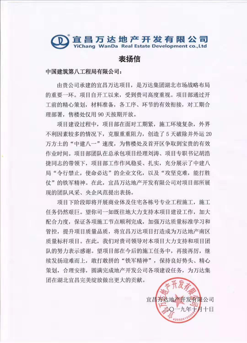 20191017日萬達地產集團領導在蒞臨項目檢查后,對項目各項工作給予了高度評價。為此,業主特別頒發表揚信,在信中對公司與宜昌萬達項目部同志們前一階段的工作表示了認可和贊揚,勉勵項目繼續發揚“令行禁止、使命必達”的鐵軍精神,圓滿完成后續各項建設任務。