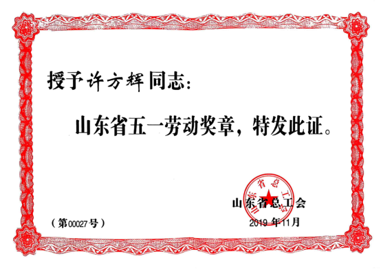 許方輝榮獲山東省五一勞動(dòng)獎(jiǎng)?wù)?/font>