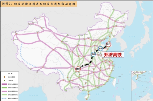 鄭濟高鐵是國家“十三五”現代綜合交通運輸體系發展規劃中“十縱十橫”綜合運輸大通道的“第十縱” (煙臺至重慶運輸通道)和山東省“三橫四縱五連”綜合運輸通道的重要組成部分,橫向連接京滬、京廣、京九等縱向干線鐵路,是河南省“米”字形高鐵網的重要組成部分。