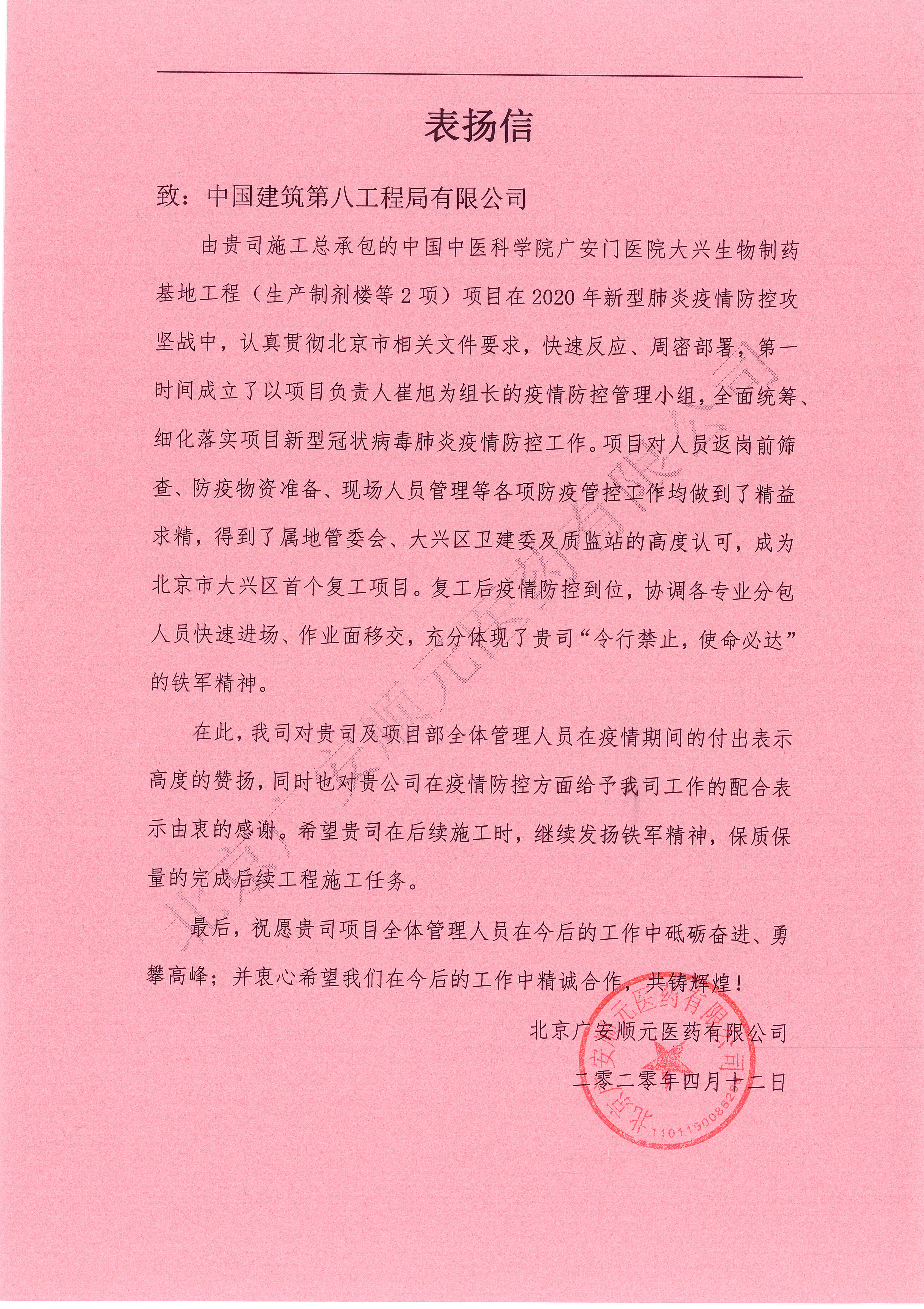 4月12日,中國中醫(yī)科學(xué)院廣安門醫(yī)院項(xiàng)目部喜獲業(yè)主單位北京廣安順元醫(yī)藥有限公司發(fā)來的表揚(yáng)信,業(yè)主單位對項(xiàng)目部在在疫情期間防控工作、組織復(fù)工等方面的展現(xiàn)出來的“令行禁止 使命必達(dá)”的鐵軍精神表示高度的認(rèn)可。