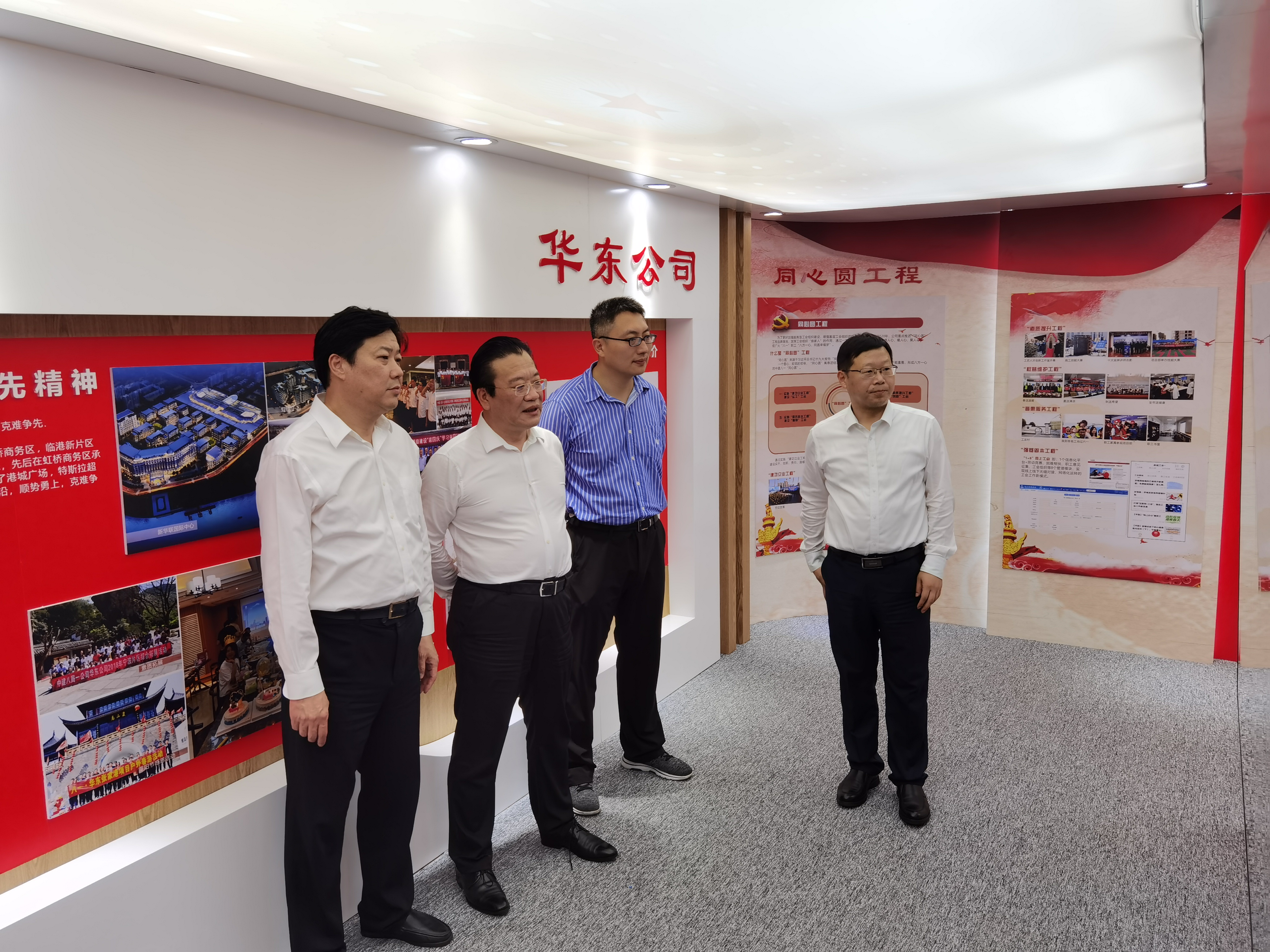 周奇一行首先參觀了項(xiàng)目同心書屋。周奇評(píng)價(jià)同心書屋實(shí)用、精致,是基層員工學(xué)習(xí)和業(yè)余生活放松的好地方。隨后,一行人參觀了項(xiàng)目黨建文化館,項(xiàng)目技術(shù)負(fù)責(zé)人萬慎行介紹了公司的發(fā)展歷程、八大管理理念、業(yè)務(wù)板塊、品牌支部和海外黨建、工會(huì)同心圓工程,觀看了公司文化宣傳片《文化的力量》。