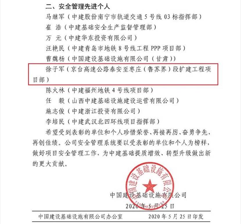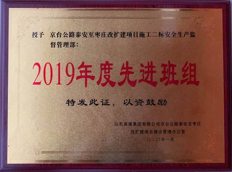 憑借全體人員不懈努力,項目在安全管理方面已榮獲一系列榮譽,包括山東高速集團有限公司2019年度先進班組、中建山東投資有限公司2019年度安全管理先進單位等榮譽稱號,項目安全總監(jiān)徐子軍還榮獲中國建設基礎設施有限公司年度安全管理先進個人稱號。