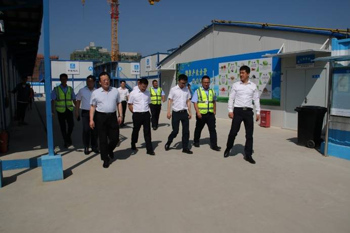 于金偉一行首先來到工人生活區參觀,深入了解一線工人們的吃、穿、用、住情況,對項目“工友村”的建設情況進行了詳細的了解,并聽取了項目運營情況作了整體匯報。于金偉對項目全體一線工人們表示感謝,并表達了對本項目的重視,為工人們發放防暑降溫物資,并囑托大家注意日常安全防護,做好防暑降溫工作。