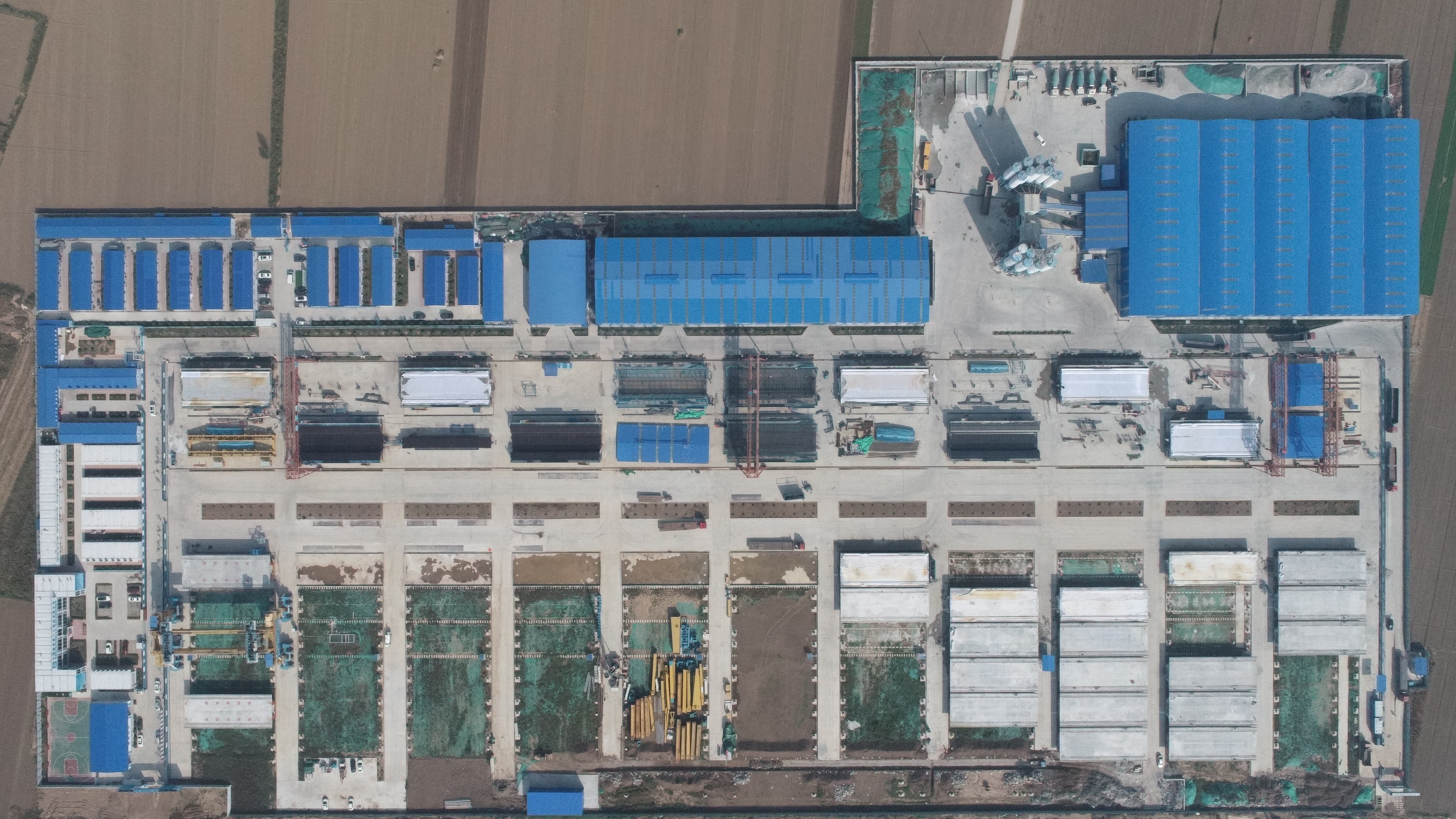 聊城東制梁場(chǎng)占地約195畝,相當(dāng)于18個(gè)標(biāo)準(zhǔn)足球場(chǎng)面積,主要包括混凝土拌和站、鋼筋加工場(chǎng)、物資庫(kù)房、制梁區(qū)、存梁區(qū)、提梁上橋區(qū)等功能區(qū)。聊城東梁場(chǎng)單月制梁最多可達(dá)到45孔,最大存梁能力為132孔。為確保一次性通過認(rèn)證、保質(zhì)保量進(jìn)行箱梁批量生產(chǎn),聊城東制梁場(chǎng)制定了詳細(xì)的工作計(jì)劃,嚴(yán)格把控鋼筋加工安裝、混凝土澆筑、張拉壓漿、移存梁等關(guān)鍵工序。