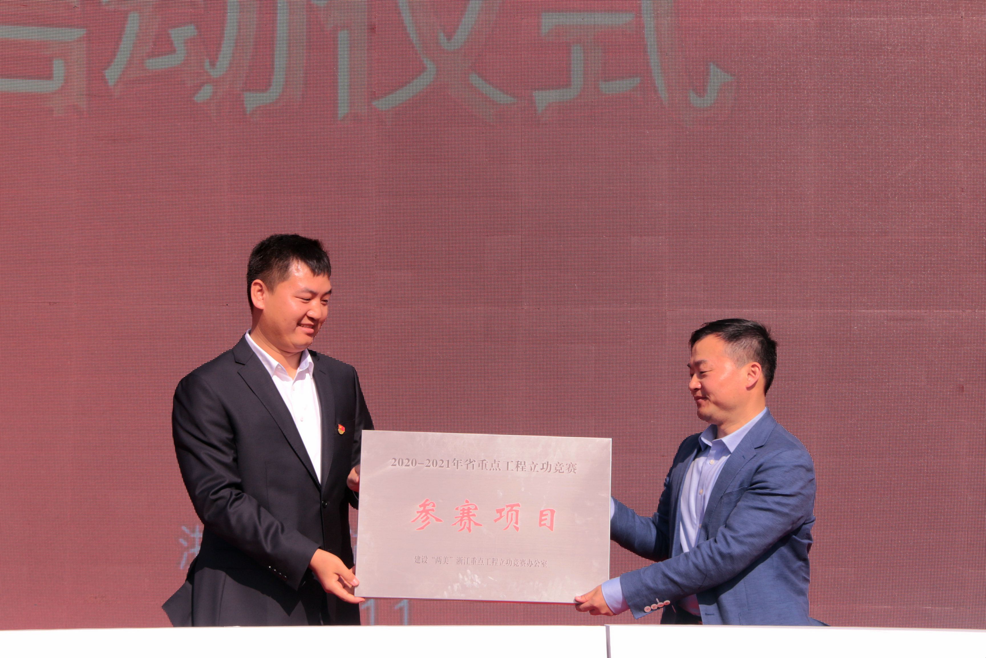 湖州市總工會副主席楊少章向中國制造2025產業園建設項目(二期工程)EPC總承包項目授予“2020-2021年省重點工程立功競賽參賽項目”獎牌。