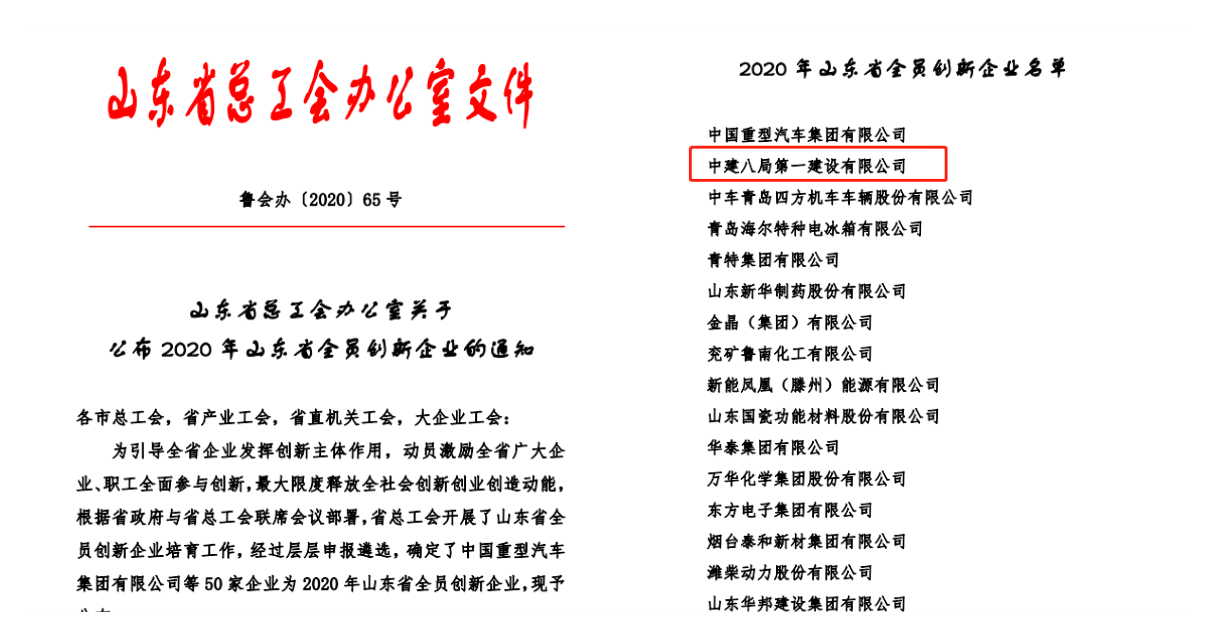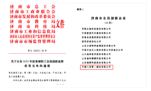 近日,山東省總工會、濟南市總工會相繼發布《關于公布 2020 年山東省全員創新企業的通知》和《關于2020年度泉城職工全員創新競賽獲獎名單的通報》,公司共榮獲5項獎項。分別是“山東省全員創新企業”、“濟南市全員創新企業”、“濟南市創新型班組(綠色產業園新型模架工廠班組)”、“濟南市創新能手(張軍)”、“濟南市職工優秀技術成果”。