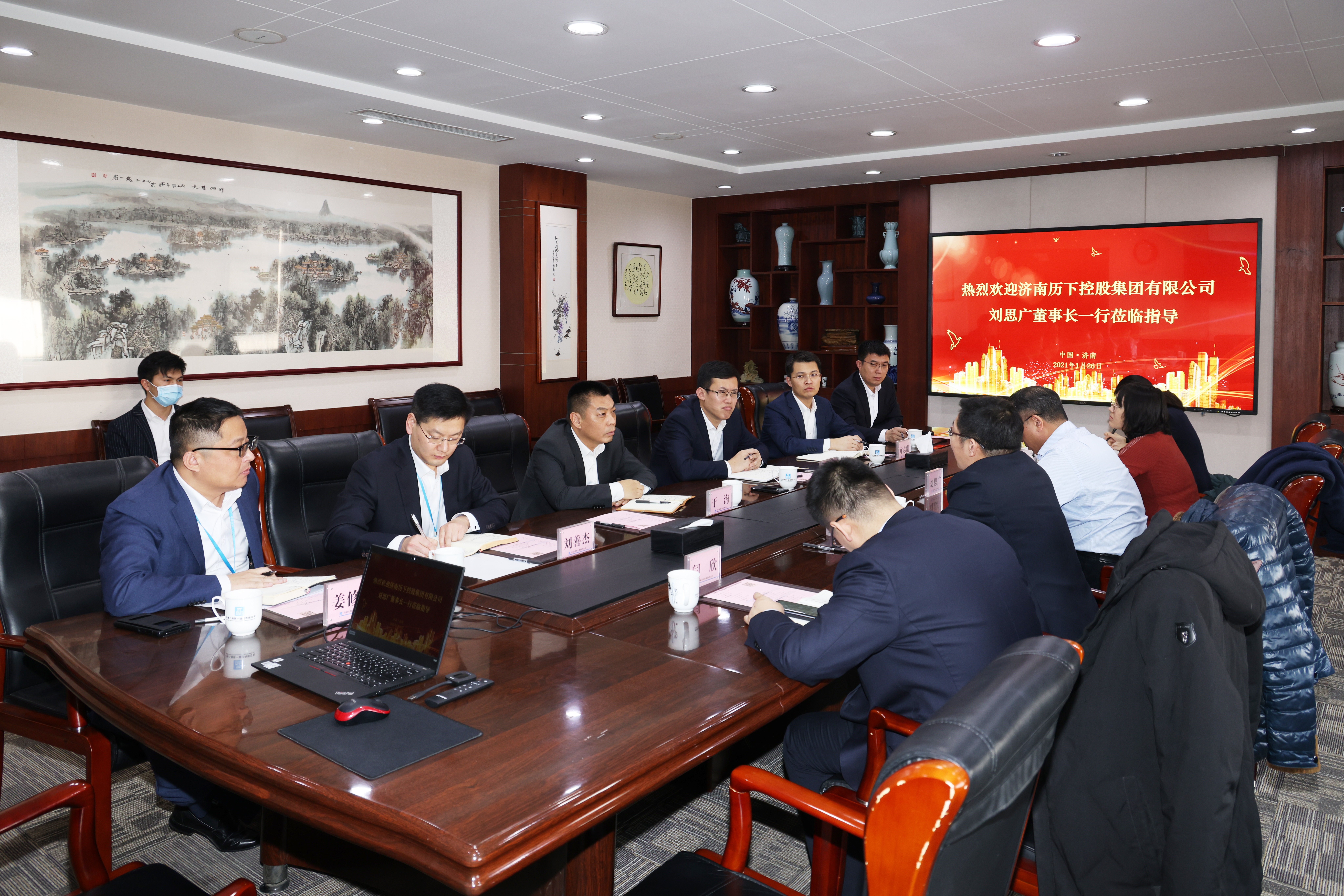 126日,濟南歷下控股集團有限公司董事長、總經理劉思廣一行到訪公司總部,與公司黨委書記、董事長齊朋就進一步加強合作進行深入交流。