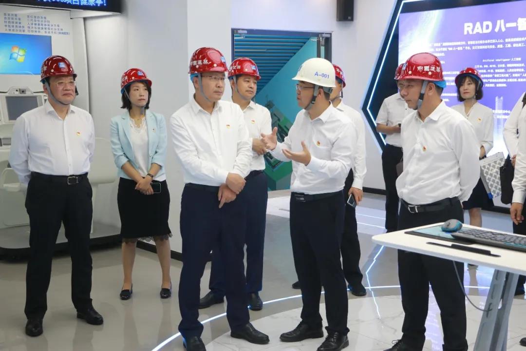 崔景山一行參觀了項目RAD八一智能建造館和黨建文化館,調研了項目智慧工地建設和黨建工作開展情況。崔景山對智能安全帽等智能設備在現場的應用、項目的黨建文化建設及“領航568“黨建品牌表示充分肯定。
