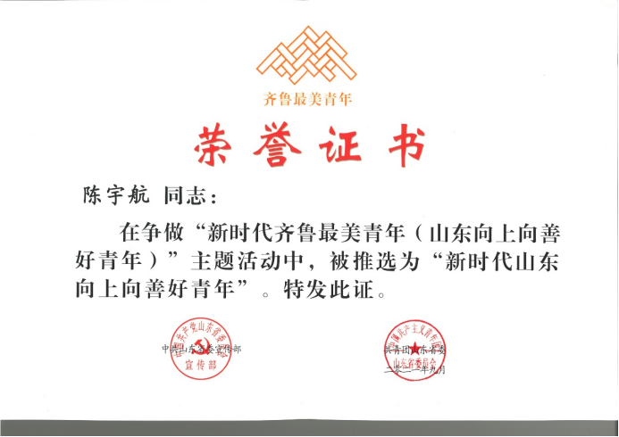 陳宇航榮獲“新時代山東向上向善好青年”!