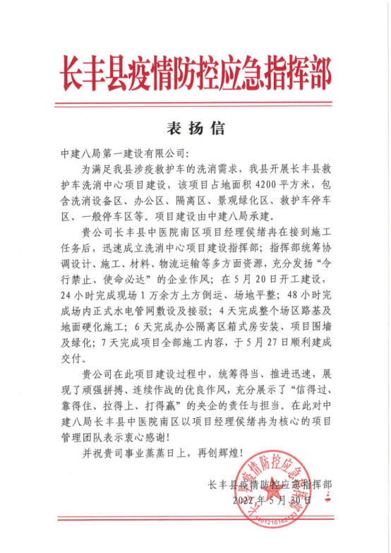 5月30日,長豐縣疫情防控應急指揮部為中建八一發來感謝信,充分肯定了公司在長豐縣救護車洗消中心項目建設工作中彰顯的責任與擔當,對“令行禁止,使命必達”的企業作風高度贊揚。