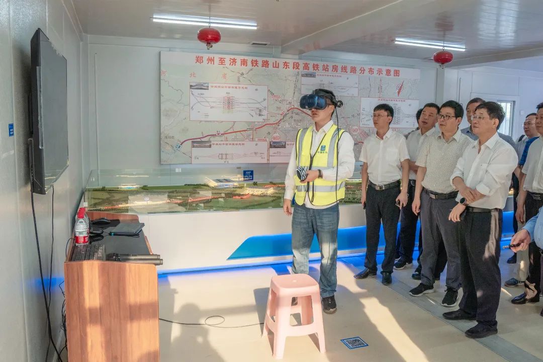王同軍一行來到聊城西站升降式沙盤室,聽取了濟鄭鐵路山東段高鐵線路走向、聊城西站建設規模、設計理念、工期計劃等方面的匯報,通過VR詳細了解了工程內外裝飾整體效果。