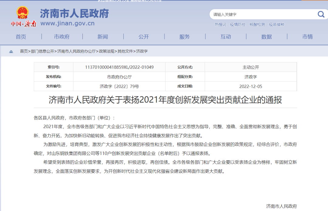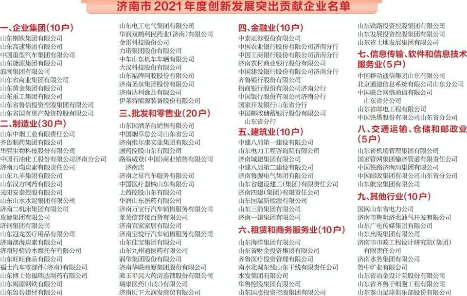 近日,濟南市人民政府發布了《關于表揚2021年度創新發展突出貢獻企業的通報》,對全市建筑業、制造業等9個板塊、共計110家企業進行表彰,建筑業共有10家企業入選,中建八局一公司連續3年位列榜首。