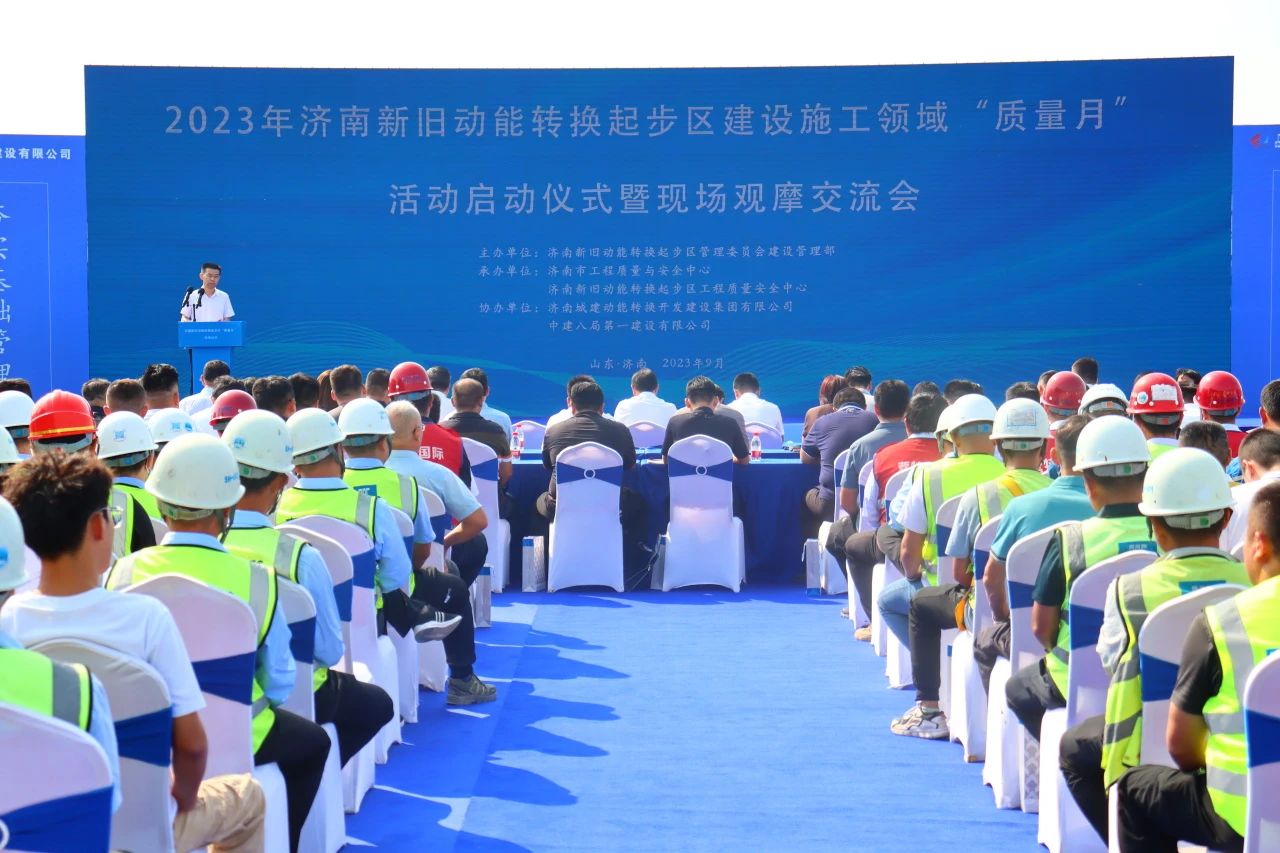 9月8日,2023年濟南新舊動能轉換起步區建設施工領域“質量月”活動啟動儀式暨現場觀摩交流會在中建八局一公司承建的黃河體育中心專業足球場項目舉行。濟南市住房和城鄉建設局、起步區管委會、濟南城建集團、中建八局一公司及各街道辦事處、建設、施工、監理(全詢)單位共200余人參與。