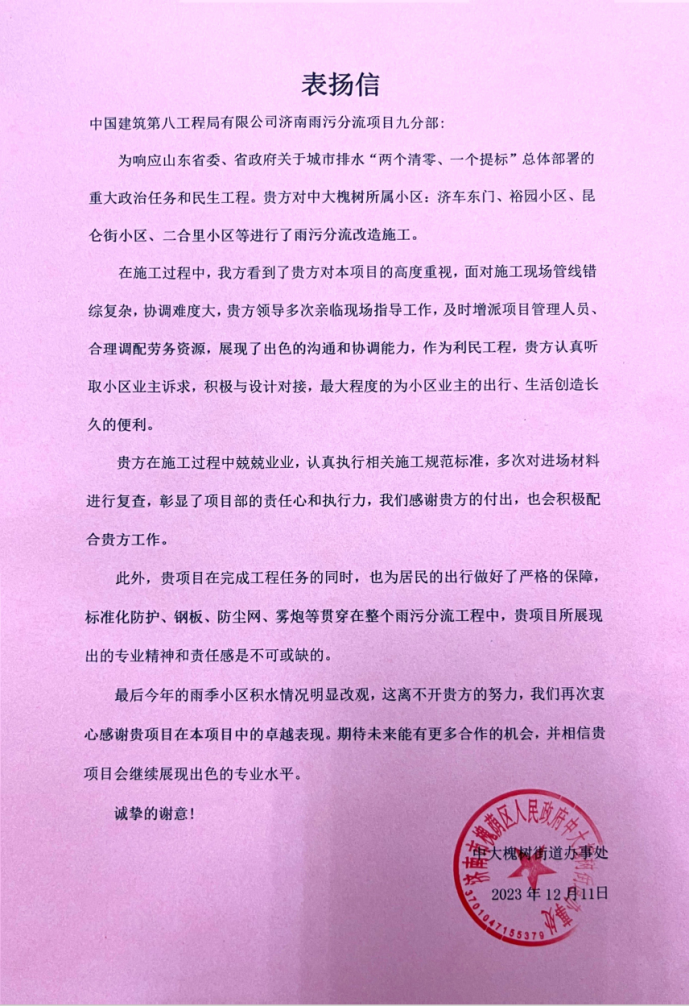 濟南雨污分流項目九分部再獲三封表揚信