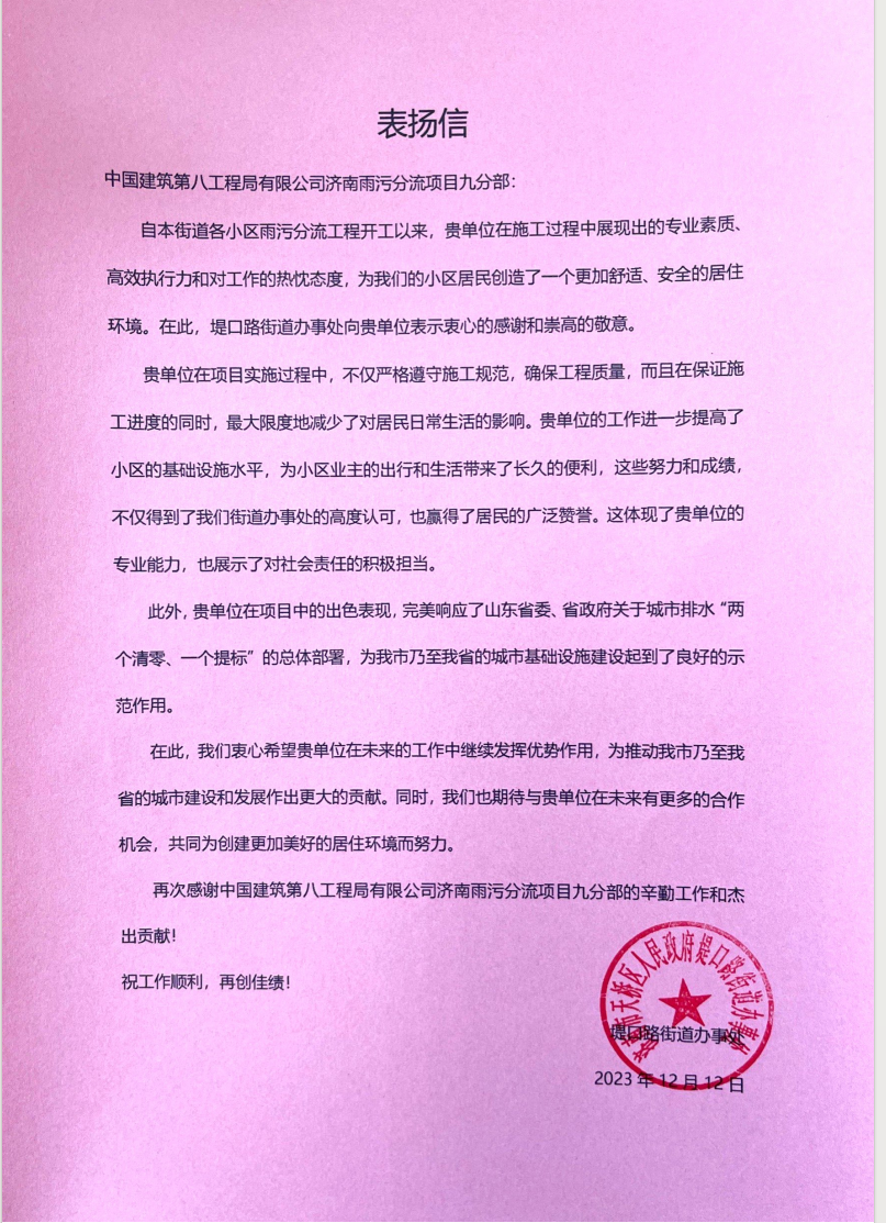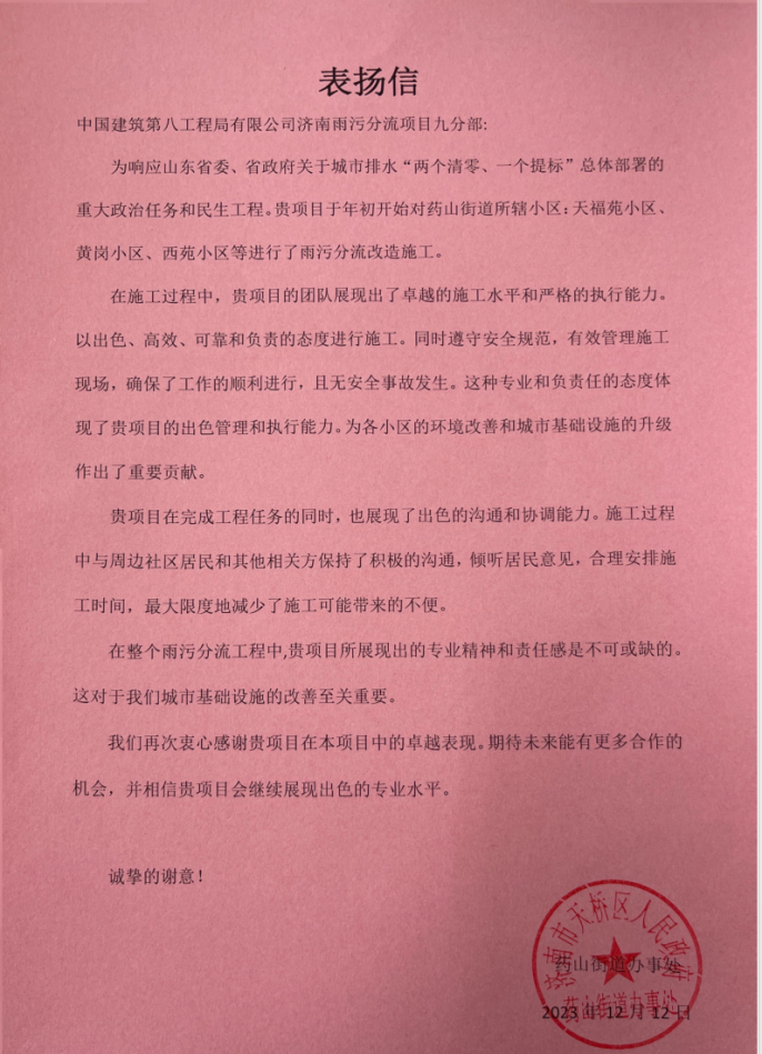 濟南雨污分流項目不僅是居民家門口的“關鍵小事”,也是環境改善的“民生大事”,截至目前,項目部已相繼收到錦旗四十余面及多封感謝信、表揚信。