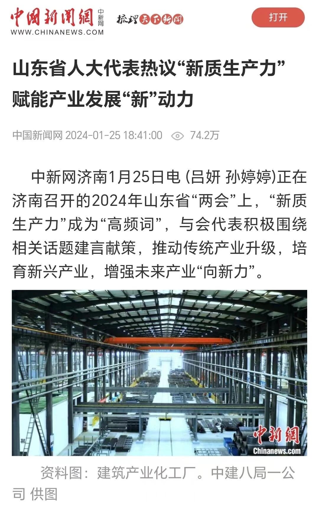 1月25日,2024年山東省“兩會”期間,中國新聞網刊發題為《山東省人大代表熱議“新質生產力” 賦能產業發展“新”動力》的報道。山東省人大代表、中建八局一公司黨委書記、董事長齊朋就“新質生產力”推動建筑業高質量發展等相關問題分享了自己的觀點和建議。