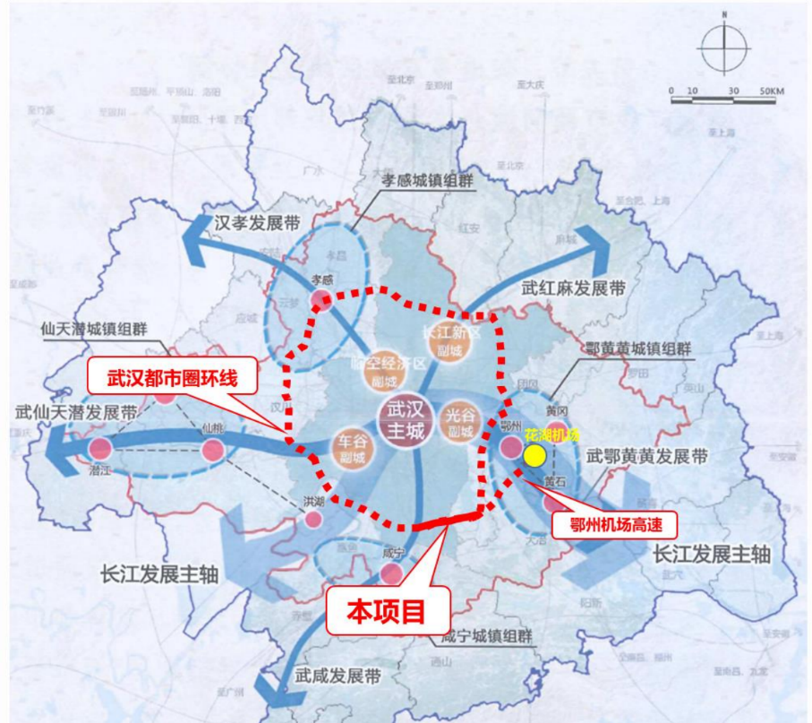 ▲武漢都市區環線江夏至梁子湖段(南段)工程,全長36km,建成后將形成武漢大都市區“1小時通勤圈”。