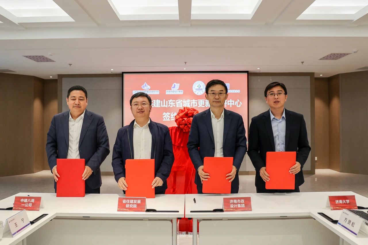 會上,省住房和城鄉建設發展研究院、濟南市政設計集團、濟南大學、中建八局一公司相關負責人簽署了四方共建協議;省住建廳國際合作處負責同志、共建單位負責人共同為山東省城市更新創研中心揭牌;濟南市政設計集團規劃所做城市更新案例交流。