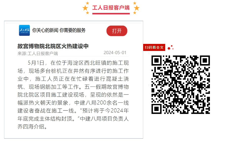 內容摘要:5月1日,工人日報客戶端報道《故宮博物院北院區火熱建設中》,點贊中建八局故宮博物院北院區項目200余名建設者堅守崗位保進度,正在進行混凝土澆筑、現場鋼筋加工等工作。