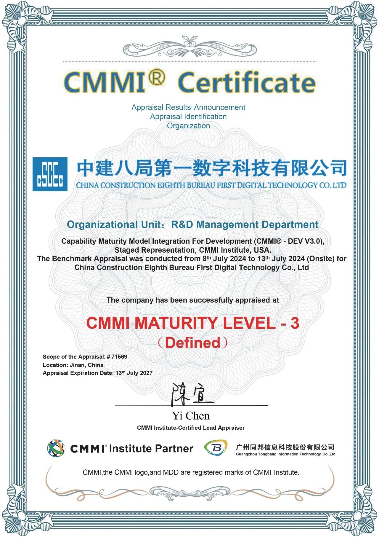 中建八局第一數(shù)字科技有限公司通過(guò)CMMI-3級(jí)認(rèn)證