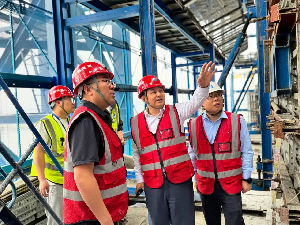 在上海重點項目,牛化憲深入施工一線,詳細了解項目履約進度、精益管理情況,實地檢查了現場大型機械、臨時用電、爬模及鋁模支撐架搭設等管理落實情況,并提出五點要求:一是強化履約擔當,動態統籌大型機械布設,加快基坑及主體區域施工進度,確保項目如期交付;二是筑牢安全防線,嚴格規范汽車吊作業警戒區域管理,加大電箱接線、現場消防配置、切割機防護等環節的管控力度,提高巡檢二維碼應用實效,保障項目平穩推進;三是重視爬模作業管控,杜絕作業面材料過量堆載,保證爬模限位銷正確安裝;四是提高質量標準,堅持以方案指導施工,推進地下室滲漏專項治理,加強鋁模支撐架體管控,打造精品工程;五是深化精益管控,細化項目管理流程,優化資源配置,全面提升經營質效。