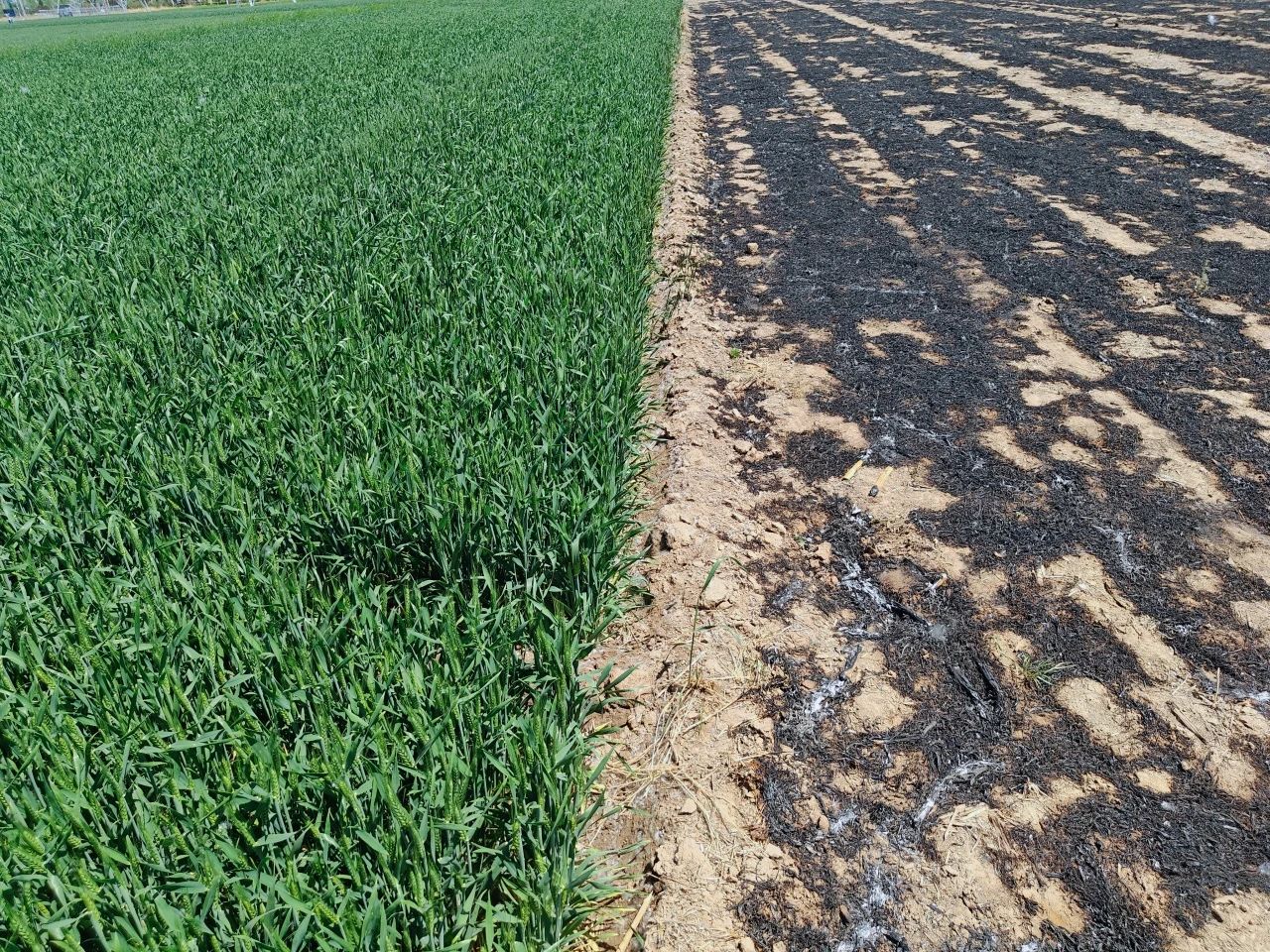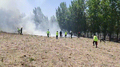 大家按照預案快速分成三組,與屬地消防隊開始聯合行動,一組隊員手持干粉滅火器,以扇形戰術向火場核心推進,撲滅點狀火源;二組隊員駕駛灑水車構建“水幕墻”,截斷火勢蔓延的路徑,并為當地消防車補充水源;三組隊員揮動斧頭鐵鍬,在火場外圍緊急開辟防火隔離帶,嚴防飛火復燃。隨著項目與當地消防隊員的通力協作,1小時后現場明火已經基本撲滅,此時火場與麥田僅僅一線之隔。