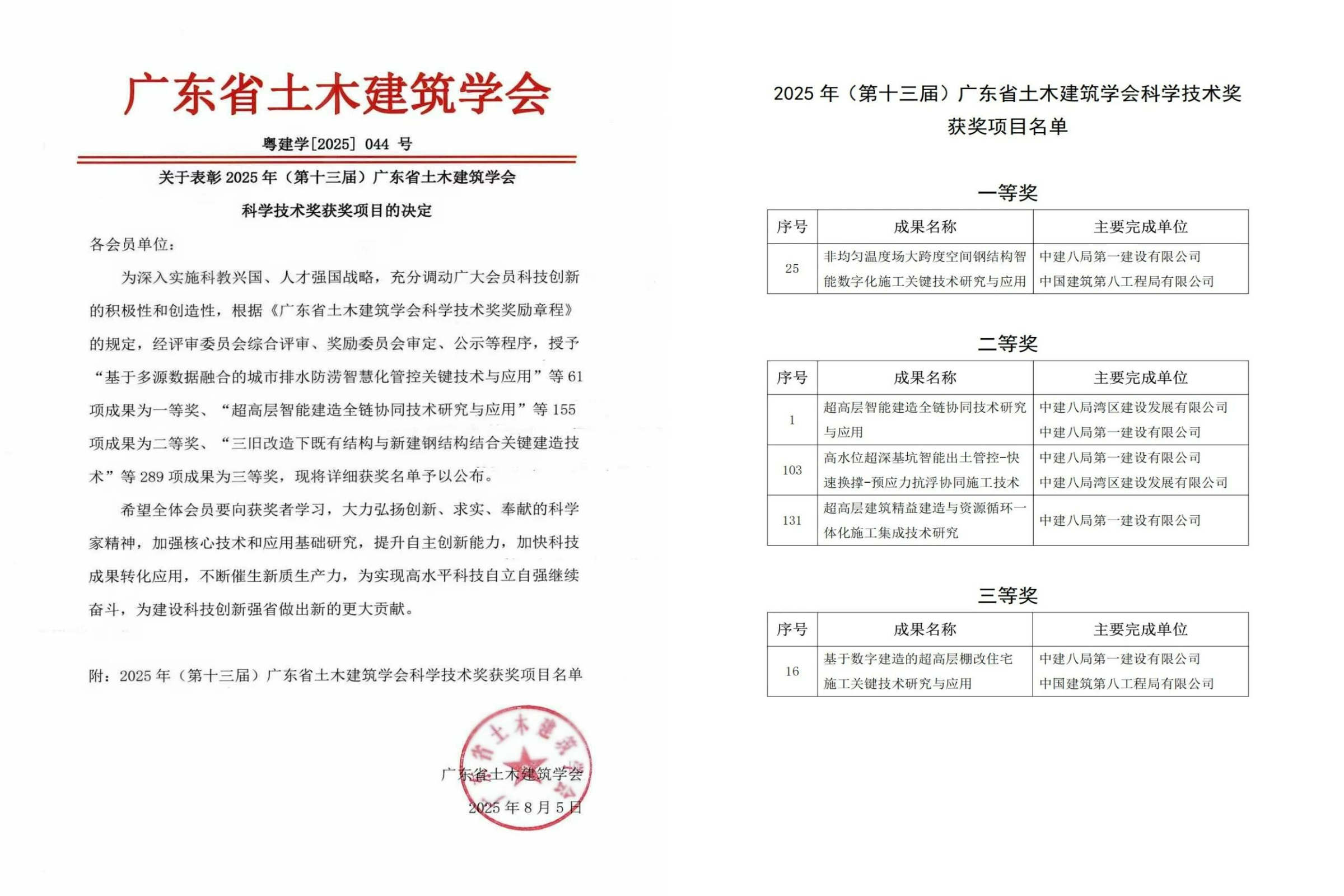 近日,第十三屆廣東省土木建筑學會科學技術獎獲獎項目公布,中建八局一公司榮獲一等獎 1 項、二等獎 3 項、三等獎 1 項,成果涵蓋會議會展、商業綜合體、超高層建筑、棚改住宅等領域,以科技創新賦能“好產品”。
