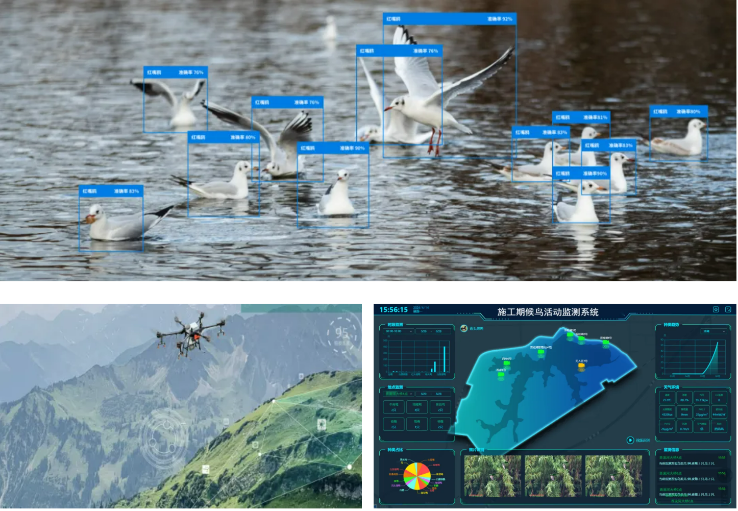 綠色環保展區針對沉湖濕地生態保護需求,建立鳥類遷徙、魚類產卵期動態監測機制,研發基于人工智能的候鳥活動監測系統,利用高清攝像頭、聲音傳感器和 AI 算法,檢測鳥類聚集或敏感行為,通過水質監測設備采集水溫等關鍵信息,并針對性調整施工計劃,確保工程建設與自然環境和諧共存。