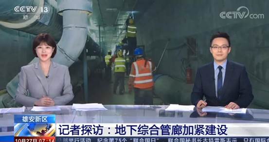 10月27日,CCTV-13《朝聞天下》、CCTV-13《新聞直播間》,CCTV-2《天下財經》欄目以《雄安新區 記者探訪:地下綜合管廊加緊建設》為題,連續報道了中建八局一公司參與建設的雄安站樞紐片區市政道路、綜合管廊、排水管網系統(一期)工程,指出地下綜合管廊建設是執行“先地下后地上”方案,推動雄安基礎設施建設的重要內容。