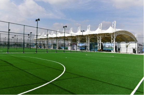 觀摩展示區(qū)位于一塊7人制的風(fēng)雨球場(chǎng)中,球場(chǎng)采用了膜結(jié)構(gòu),潔白的“外殼”將綠色的足球世界擁抱其中,交相輝映。觀摩團(tuán)在這個(gè)球場(chǎng)里觀看了濱州國(guó)際足球運(yùn)動(dòng)小鎮(zhèn)的宣傳視頻,并欣賞了足球運(yùn)動(dòng)健兒的花式足球表演。