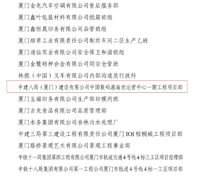 近日,廈門市總工會授予中建八局(廈門)建設有限公司中國數碼港海西運營中心一期工程項目部“廈門市工人先鋒號”稱號。