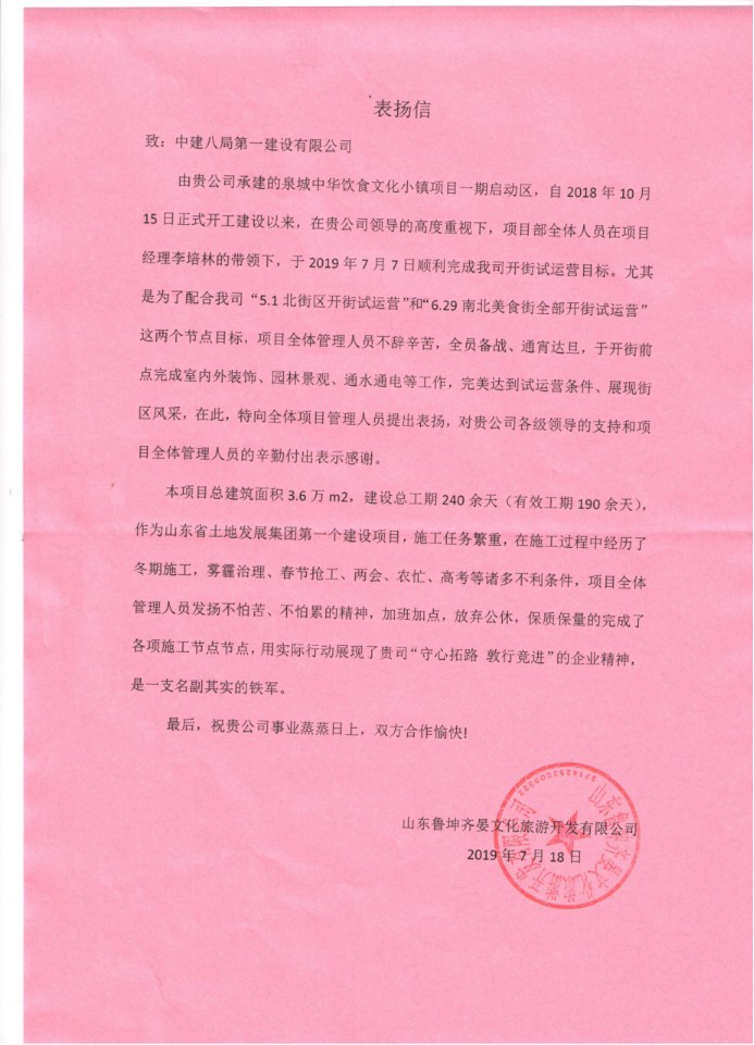 7月22日,泉城中華飲食文化小鎮(zhèn)項(xiàng)目收到山東魯坤齊晏文化旅游開發(fā)有限公司對(duì)公司及項(xiàng)目部的表?yè)P(yáng)信。
