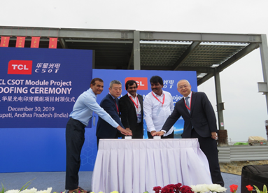 20191230日,華星光電印度模組項目主廠房成功舉行封頂儀式,印度安得拉邦立法議員 MR. MADHU,印度安得拉邦工業基礎設施管理部常務董事MR.MADI,印度安得拉邦政府投資促進和基礎設施發展特別代表MR.PRATAPTCL集團副總裁、TCL華星光電高級副總裁趙軍,TCL華星印度模組項目總經理江友東,中建八局助理總經理、海外事業部總經理吳建國,中建八局一公司海外事業部總經理王昭仙以及當地各級政府官員、項目各分包單位等一同出席了活動儀式。
