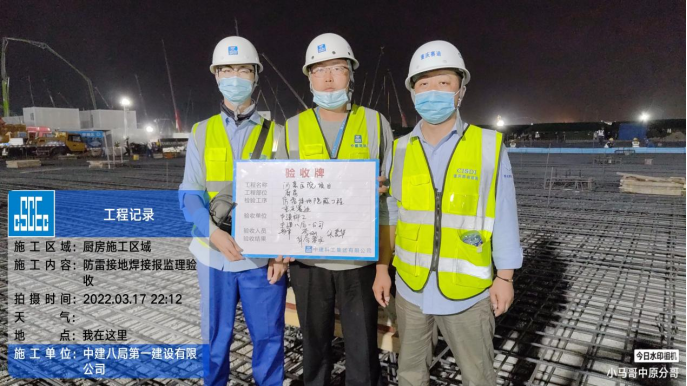 一公司負責廚房標段的機電安裝和管道鋪設工作,自從3月17日下午3點場地具備作業條件以后,項目團隊跑步進場,8名工程師、24名工人全工程穿插施工,在6小時內完成了全場防雷接地工作,累計焊接359個點位,并與當晚10點提前通過驗收,為機電專業的后續大穿插施工奠定了良好基礎。